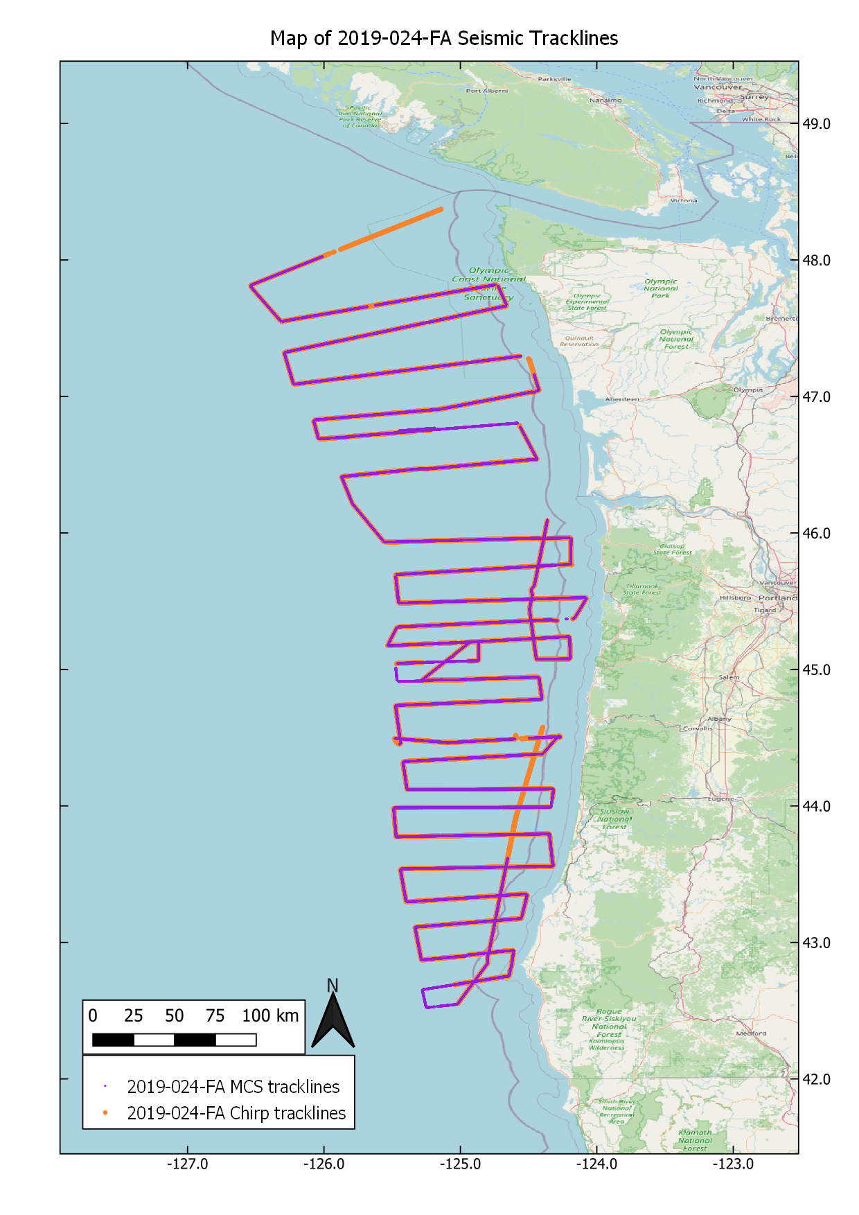 High-resolution multichannel sparker seismic (MCS) data and chirp sub-bottom data were collected by the U.S. Geological Survey in collaboration with the University of Washington (UW) in the summer of 2019 along the Cascadia submarine forearc offshore Oregon and Washington. Data were acquired to characterize quaternary deformation and sediment dynamics along the central and northern Cascadia margin. A total of 62 tracklines were collected and extend from the nearshore to the deformation front and were spaced between 25 and 50 kilometers apart. This work occurred on UW’s R/V Rachel Carson (UW cruise IDs RC0028 and RC0029). MCS data were collected coincidently with chirp sub-bottom data. These data and information are intended for science researchers, students, policy makers, and general public.